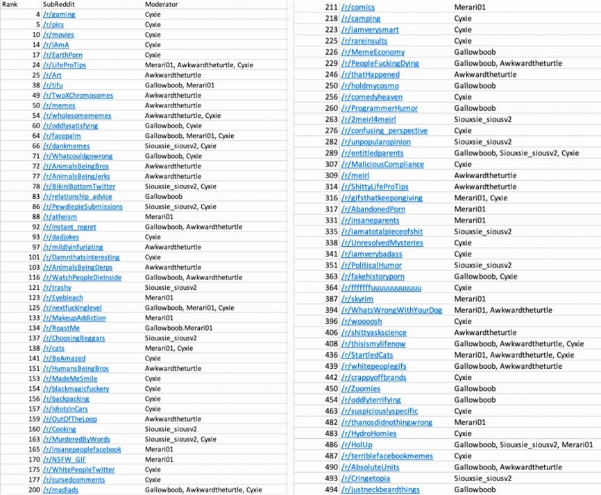 I know volunteers are super important, but power needs to be limited. When a few people moderate too many subs, it becomes a problem. All of these subs were moderated by ~6 people. This is where digg's efforts to distribute oversight could be a key differentiator.